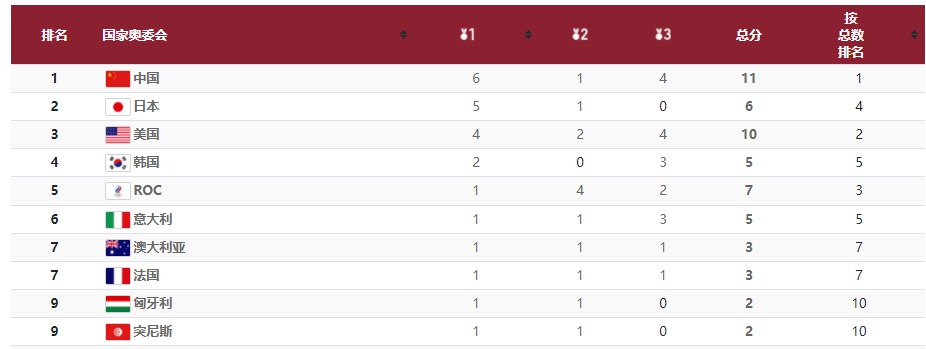 2021年7月25日,东京奥运会中国军团以6枚金牌位居奖牌榜首位。