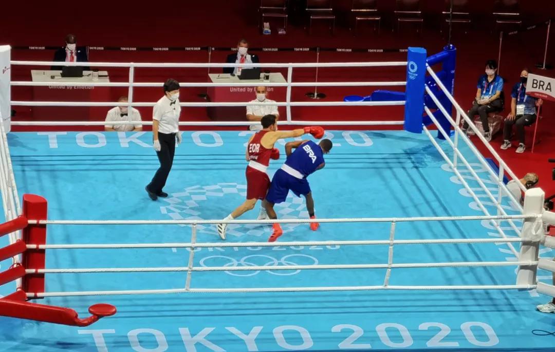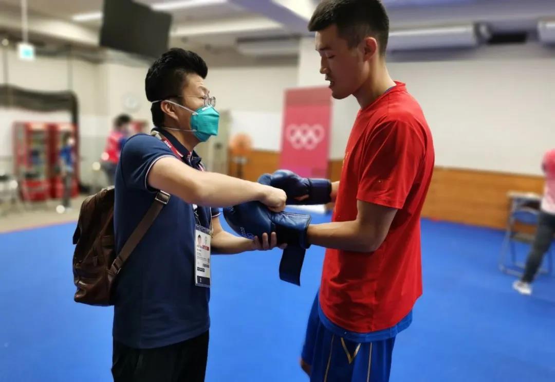 东京奥运会拳击热身馆,bwin·必赢工作人员帮助运动员穿戴拳击手套